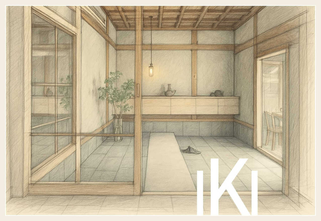 Iki (いき) is a sense of chic, sophistication, and elegance in behavior, aesthetics, and lifestyle. This concept embodies a sense of sophistication, refinement, and understated elegance in Japanese culture. It reflects a nuanced aesthetic sensibility that values simplicity, subtlety, and restraint in both personal style and behavior. Like this tastefully renovated entrance to an 80 year-old kominka in the countryside. It blends modern floating cabinets with a grand gotenjo grid pattern ceiling that you more often find in temples.